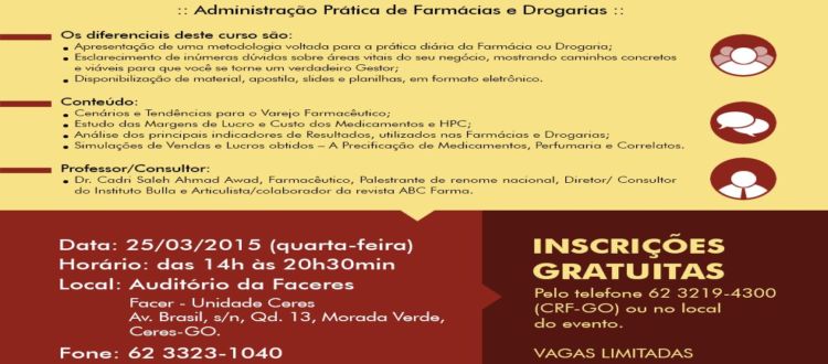 Nesta quarta-feira, 25/3, o Sinfargo e o CRF-GO realizaram mais uma edição do Projeto Prosperar. Desta vez o programa que está levando qualificação e formando farmacêuticos empreendedores em Goiás fez parada na linda cidade de Ceres. O Curso de Administração Prática de Farmácias e Drogarias, ministrado por Cadri Awad, do Instituto Bulla, é direcionado a farmacêuticos gestores, […]