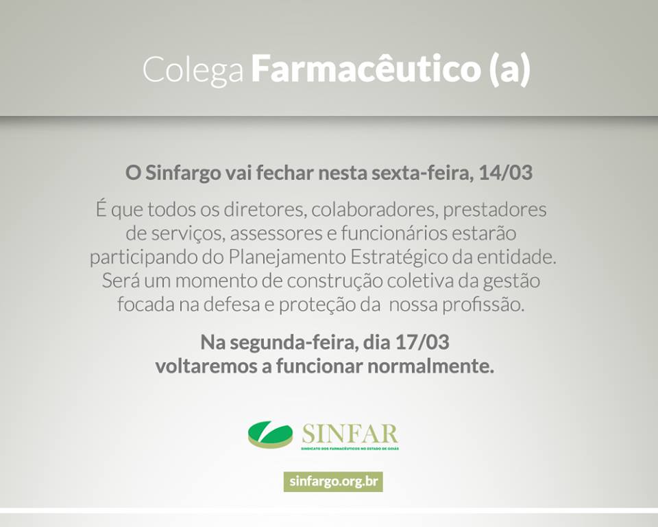 Vamos planejar as estratégias e ações da entidade com foco na defesa e proteção dos farmacêuticos (as)Voltaremos a funcionar normalmente na segunda, 17/03.