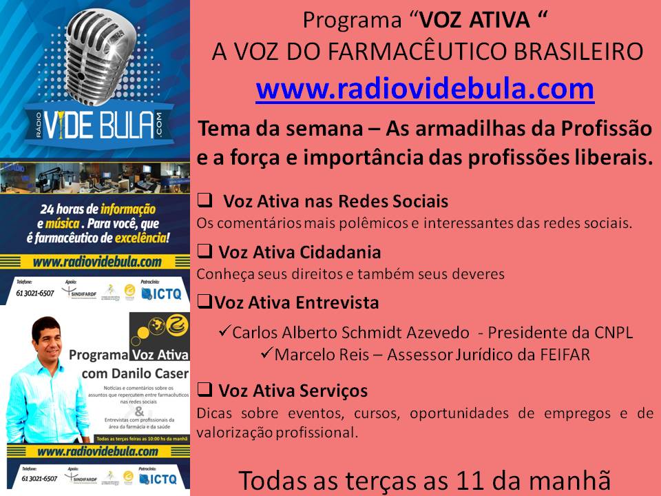 Na Rádio Web Vide Bula através do site www.radiovidebula.com. O Programa Voz Ativa é apresentado pelo Farmacêutico Danilo Caser , presidente da Fiefar diretor do Sinfar-GO, e transmitido todas as terças-feiras as 11 da manhã com reprise às quintas-feiras no mesmo horário. O arquivo de áudio do programa também pode ser acessado em qualquer dia e […]