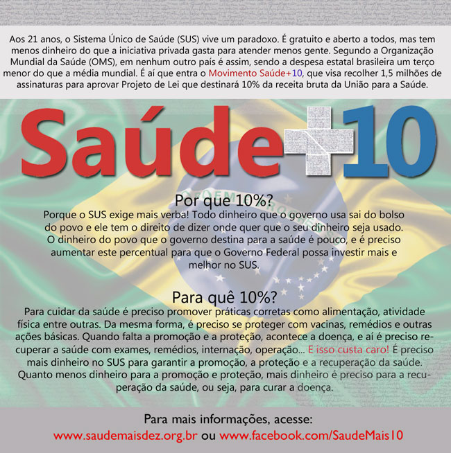 O Projeto de Lei de Complementar 141/12, que prevê o repasse de 10% das receitas correntes brutas da União para a Saúde Pública Brasileira, é de iniciativa popular, mas precisa do apoio de TODA população para que seja apreciado no Congresso Nacional, em 2013. Para que o Projeto chegue às mãos dos parlamentares são necessárias 1,5 milhão de assinaturas (1% do eleitorado nacional) e até o dia 15 de dezembro, pouco mais de 650 mil assinaturas haviam sido coletadas.