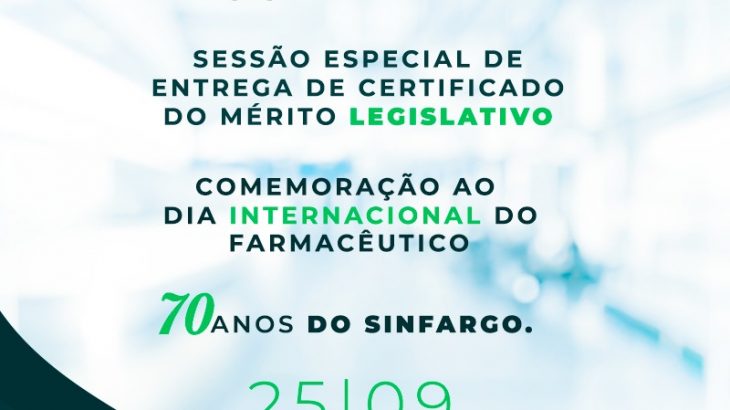 A Diretoria do Sindicato dos Farmacêuticos no Estado de Goiás convida todos os farmacêuticos e farmacêuticas para participarem de uma Sessão Especial, em Comemoração ao Dia Internacional do Farmacêutico, na Assembleia Legislativa de Goiás, onde alguns colegas serão homenageados e receberão o Certificado do Mérito Legislativo. Celebraremos ainda os 70 anos do Sinfargo e a posse da Diretoria eleita para o triênio 2019/2022.