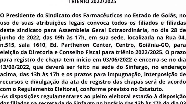 O Presidente do SINDICATO DO FARMACÊUTICOS NO ESTADO DE GOIÁS SINFAR-GO, Fábio José Basílio, no uso de suas atribuições legais, deixa público e convoca os(as) associados(as) aptos para inscrição de chapas que concorrerão às eleições para composição da Diretoria, do Conselho Fiscal e do Corpo de Suplentes do SINFAR-GO, mandato de 01/08/2022 a 31/07/2025, previstas no Estatuto, no Regimento Eleitoral e o disposto no presente edital