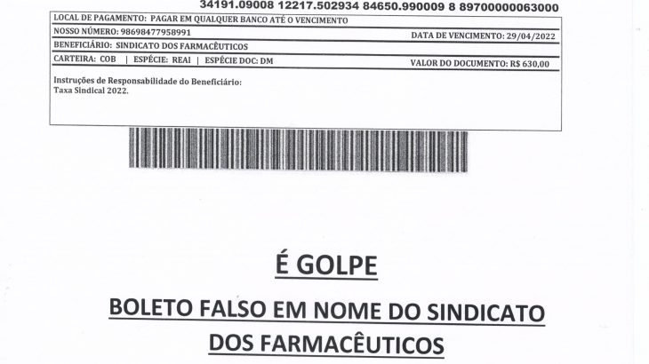 As empresas estão recebendo por e-mail este boleto falso em nome do Sindicato dos Farmacêuticos.