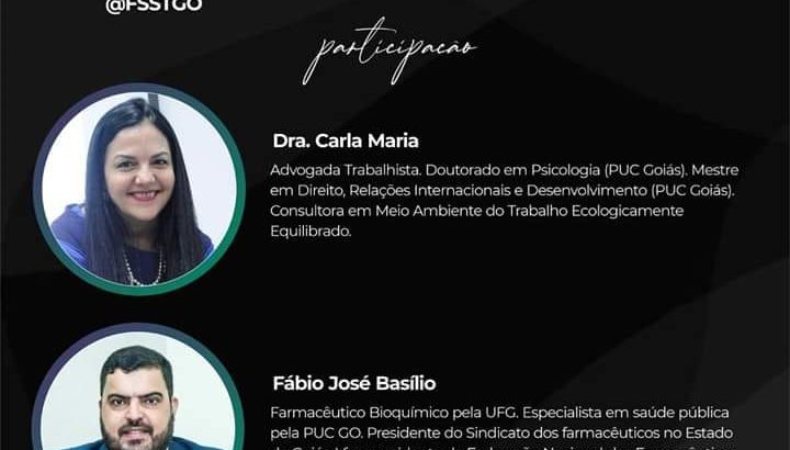 Live com a Dra. Carla Maria sobre a “Qualidade de Vida no Trabalho pós-pandemia!” Como será nossa vida no ambiente de trabalho? Uma ação do FSST-GO Fórum de Segurança e Saúde no Trabalho do Ministério Público do Trabalho, no qual o Sindicato dos Farmacêuticos de Goiás faz parte.