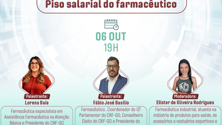 06 de Outubro às 19h Transmissão pelo YouTube/ Conselho Regional de Farmácia de Goiás / Inscrições: www.crfgo.org.br/curso
