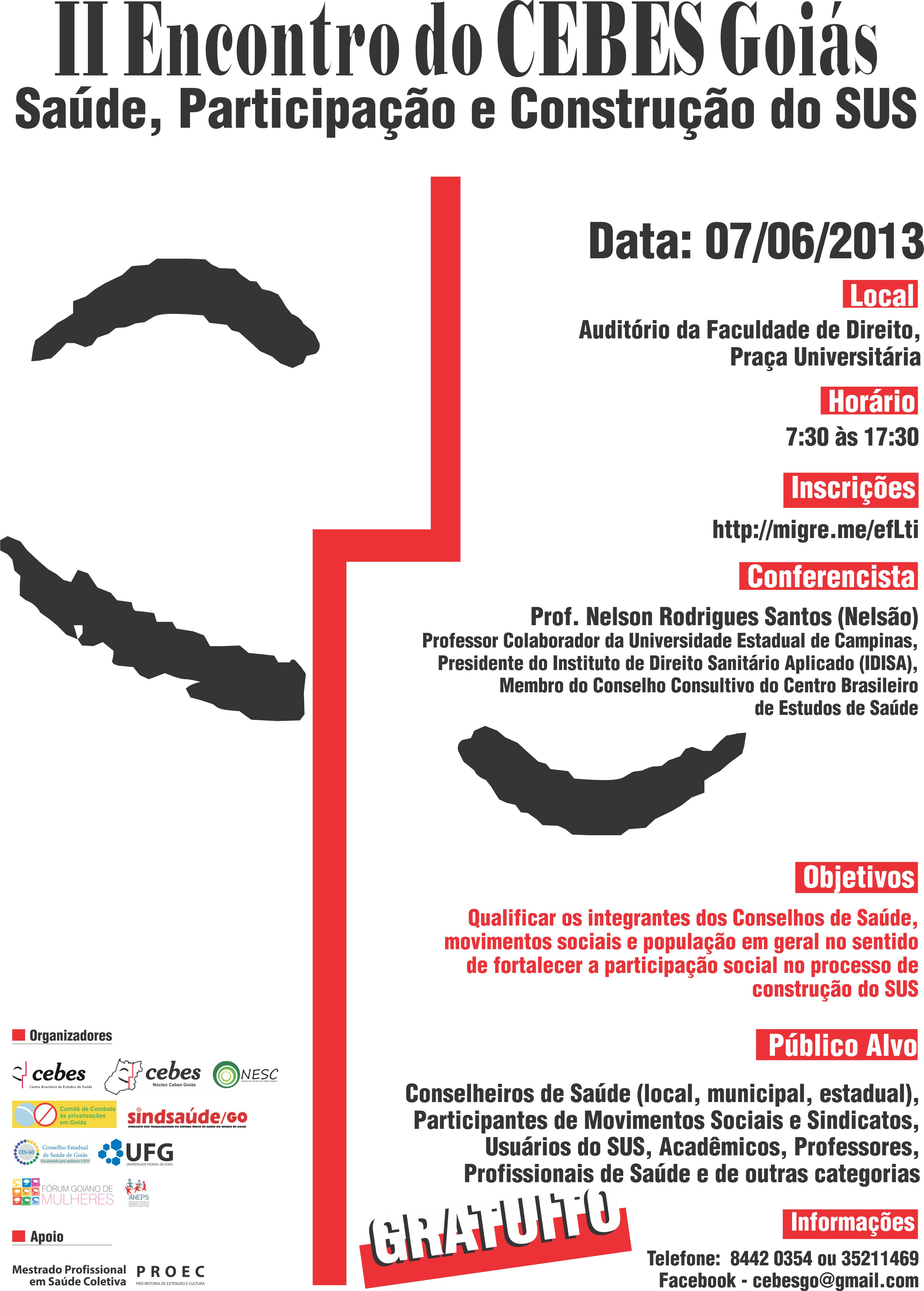 O evento será realizado na terça-feira, dia 7 de maio, das 7h30 às 17h30, no Auditório da Faculdade de Direito, Praça Universitária. Está sendo organizado por vários parceiros com o objetivo de qualificar os integrantes dos Conselhos de Saúde, movimentos sociais e população em geral no sentido de fortalecer a participação no processo de defesa e de construção do SUS em Goiás.